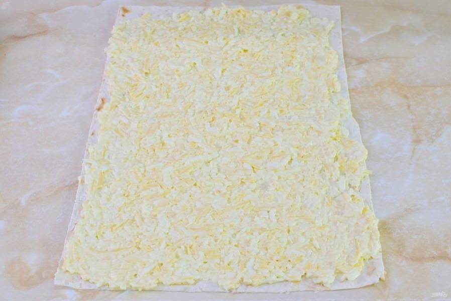 На столе расстелите лаваш. Выложите на него готовую начинку и распределите её по всей поверхности лаваша тонким слоем.
