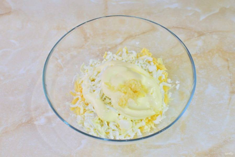Добавьте майонез. Пропустите через пресс чеснок. Все ингредиенты перемешайте до однородности.