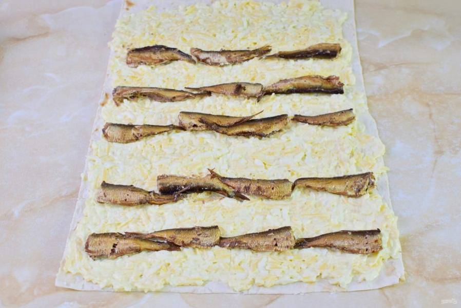 По начинке разложите шпроты.