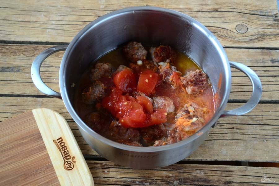 Переложите содержимое сковороды в кастрюлю, добавьте помидоры вместе с соком, еще немного посолите по вкусу.