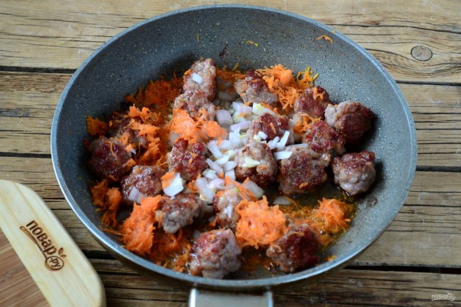 Затем добавьте измельченный лук и чеснок, натертую морковь. Жарьте несколько минут.