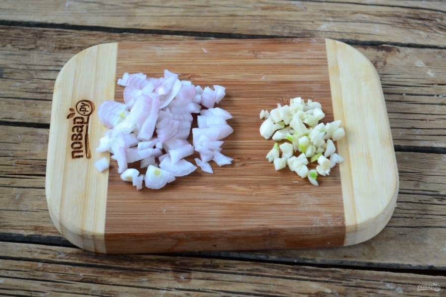 Лук и чеснок измельчите ножом или с помощью кухонного комбайна.