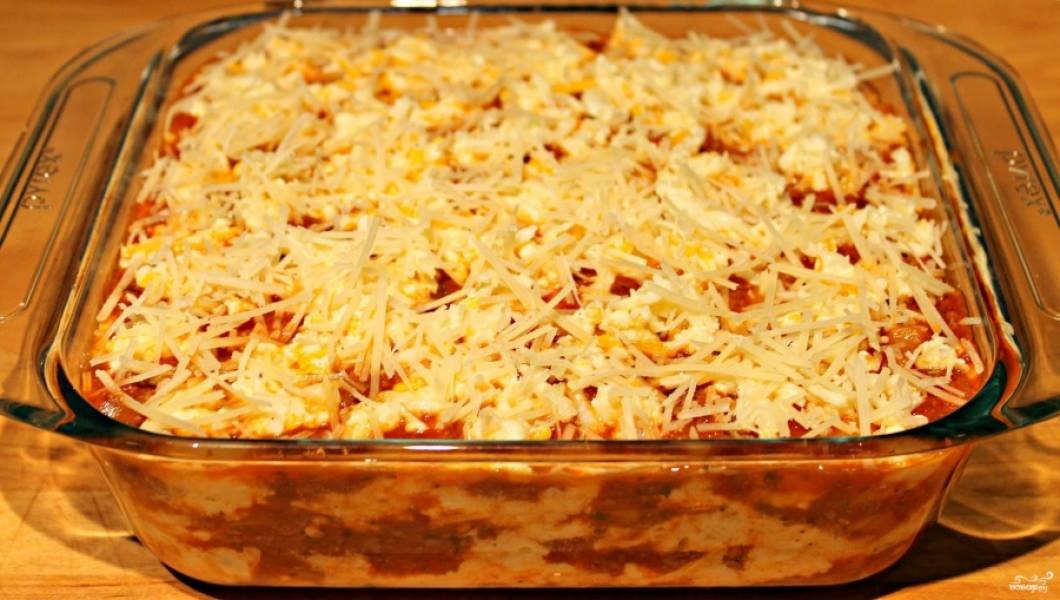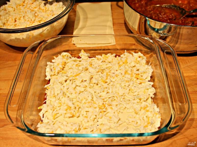 4. Теперь просто поверх сырного слоя выстилаем оставшиеся два листа лазаньи, снова посыпаем сверху сыром и отправляем в духовку запекаться на 45 минут при 190 градусах.
