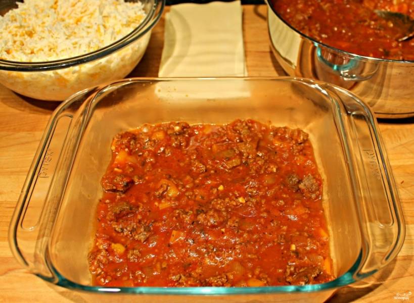 1. Для начала сделаем "мясной" слой. Для этого на растительном масле обжарим лук и чеснок, затем добавим фарш и специи, жарим, пока не испарится влага. Далее добавим томатную пасту и воду, тушим на мелком огне до готовности фарша. Дальше на дно формы застилаем два листа лазаньи, сверху выкладываем этот соус.