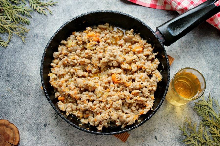 Влейте в сковороду вино и готовьте, перемешивая в течение 7-10 минут. Вино должно полностью выпариться.