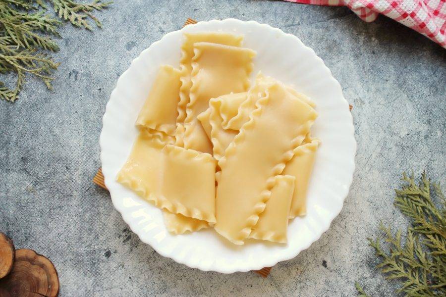 В высокую кастрюлю налейте воду, немного растительного масла, посолите и доведите до кипения. Опустите листы лазаньи и отварите в течение 5 минут, после закипания. Откиньте на сито и дайте воде полностью стечь.
