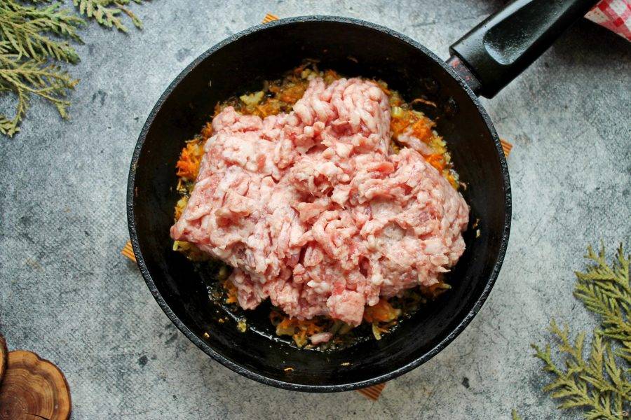 Добавьте в сковороду мясной фарш, готовьте, перемешивая примерно 5 минут. Фарш должен поменять цвет, я взяла говядину со свининой, так получается нежнее.
