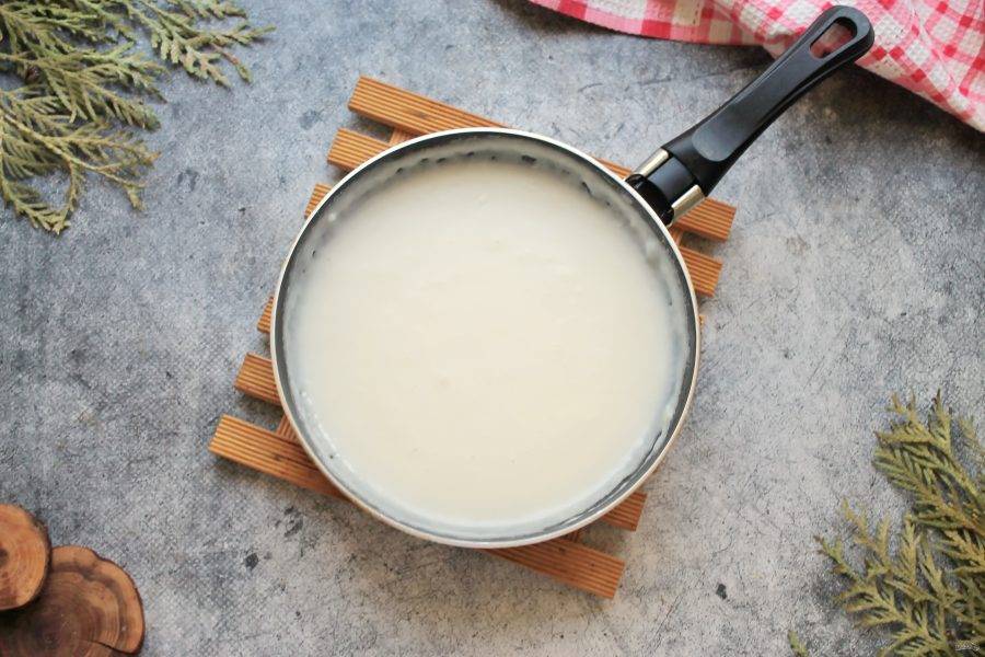 Добавьте мускатный орех. Перемешивая, вливайте тонкой струйкой горячее молоко. Варите на медленном огне до загущения, примерно 3 минуты. Снимите соус с огня.