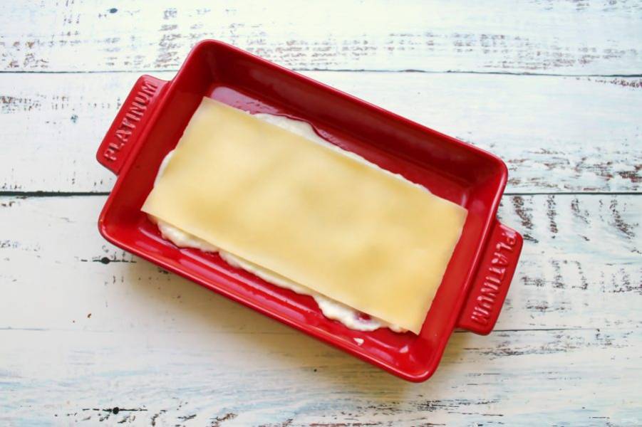 В подходящую форму для запекания выложите на дно немного соуса и на него один лист пасты.