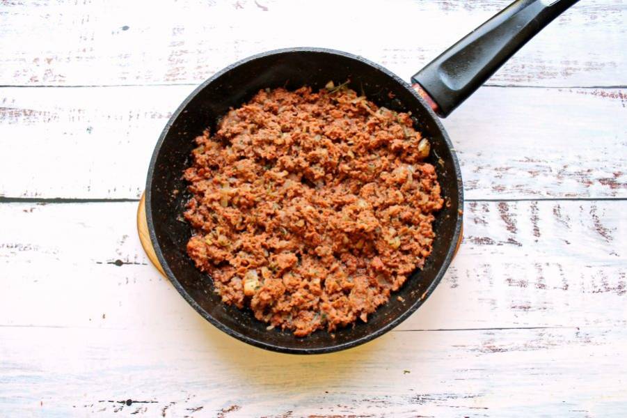Все посолите, поперчите, перемешайте и обжаривайте фарш на среднем огне под крышкой до готовности. Фарш должен полностью приготовиться, а жидкость выпариться.