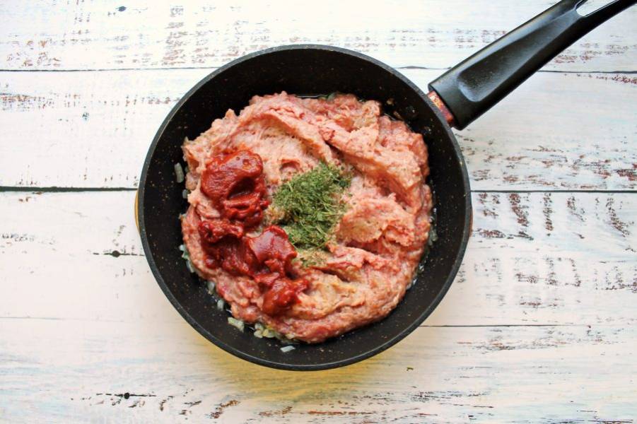 В сковороду с луком добавьте мясной фарш, томатную пасту и прованские травы.