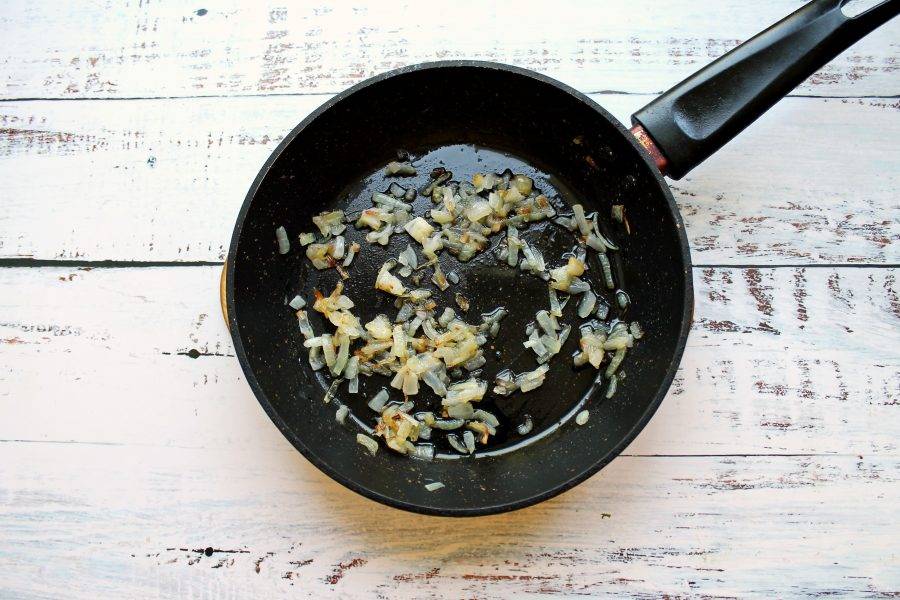 Репчатый лук почистите и мелко порежьте. Обжарьте репчатый лук в растительном масле на среднем огне в течение 5-7 минут.