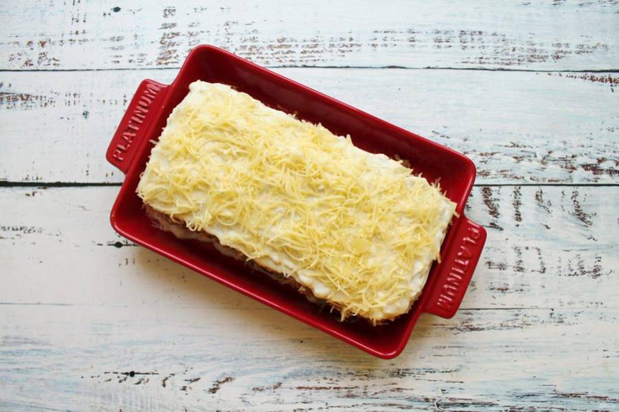 Повторите слои, пока не кончатся листы пасты. Верхним слоем должен стать лист лазаньи.