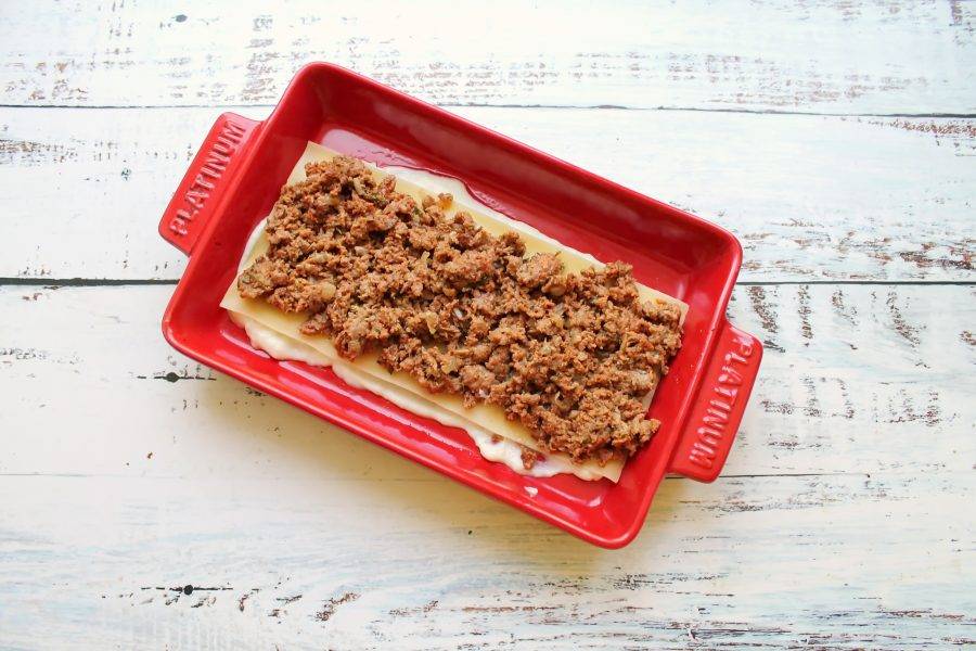 Лист лазаньи смажьте соусом и выложите ровным слоем часть фарша.