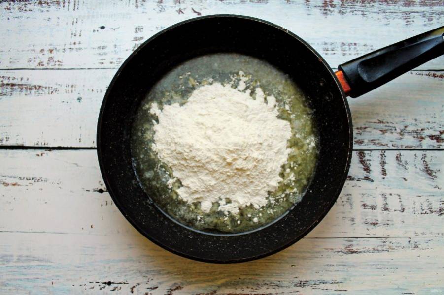 В другой сковороде растопите сливочное масло, всыпьте муку и, перемешивая, жарьте все в течение 2-3 минут на среднем огне.