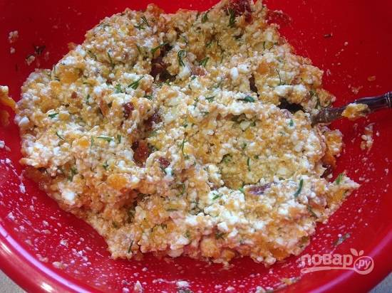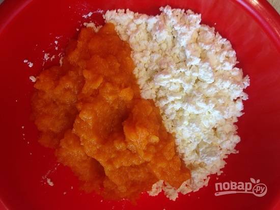 3. Если творог у вас очень мокрый, лучше отжать его. Измельчаем творог и добавляем к нему тыквенное пюре.