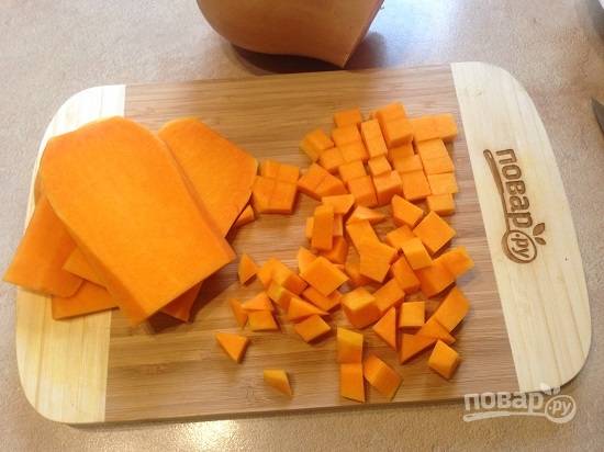 1. Тыкву очистим и нарежем на небольшие кусочки. Затем тыкву можно отварить, а можно запечь. Я отваривала.