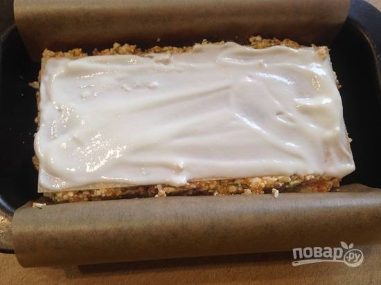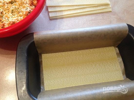 6. Лазанью я буду запекать в форме для выпечки хлеба. Застилаю пергаментом (так будет легче достать готовую лазанью). И выкладываем первый лист для лазаньи. У меня листы, которые не нужно предварительно отваривать.