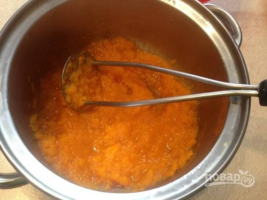 2. Добавляем к тыкве примерно полстакана воды и треть чайной ложки соли, варим минут 15. Отваренную тыкву превращаем в пюре.