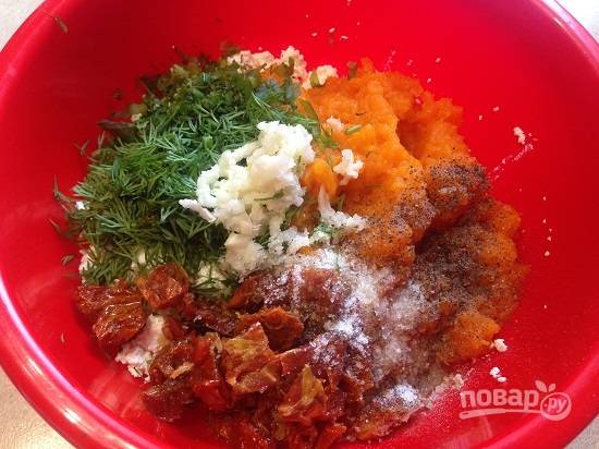 4. Добавим мелко нарезанную зелень и вяленые помидоры, пропущенный через чеснокодавку чеснок, соль по вкусу, молотый черный перец и базилик.