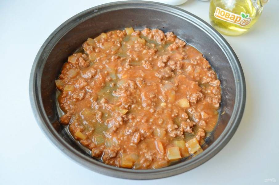 6. Добавьте фарш, обжарьте минут 5-7 его с овощами, после влейте томатный соус и протушите все вместе 5-7 минут.
