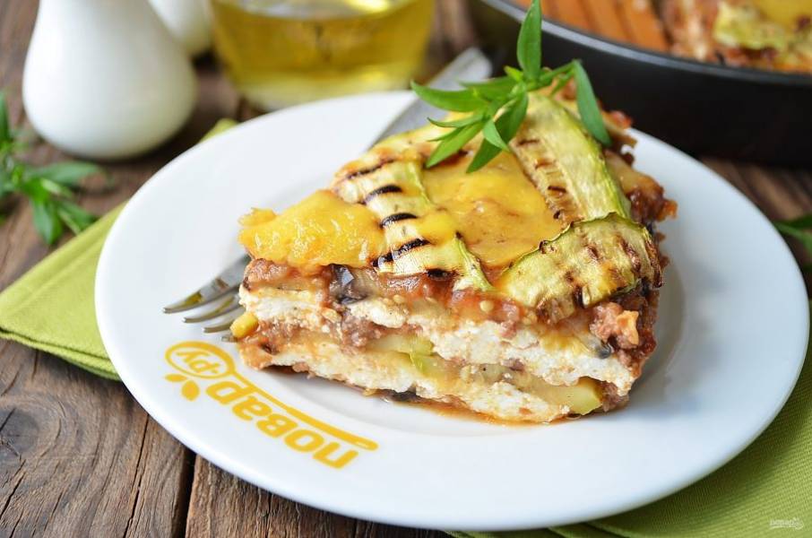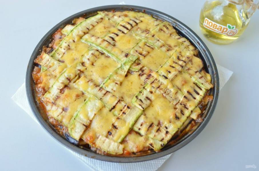 14. Кабачковый слой щедро смажьте томатным соусом, далее — рикотта, сыр. И так повторяйте слои, пока не закончатся продукты. Последний слой сделайте из кабачков, красиво уложенных сеточкой. Присыпьте сыром. Отправьте лазанью в горячую духовку (разогретую до 200 градусов) на 30-35 минут.