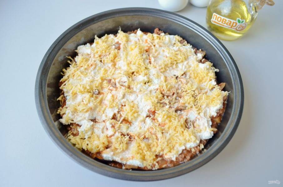 12. Распределите часть рикотты, присыпьте твердым сыром сверху.