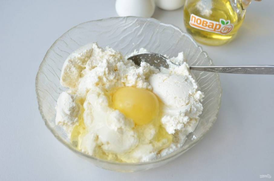 8. Рикотту соедините с яйцом, щепоткой соли и перца, перемешайте. Твердый сыр натрите на мелкой терке.