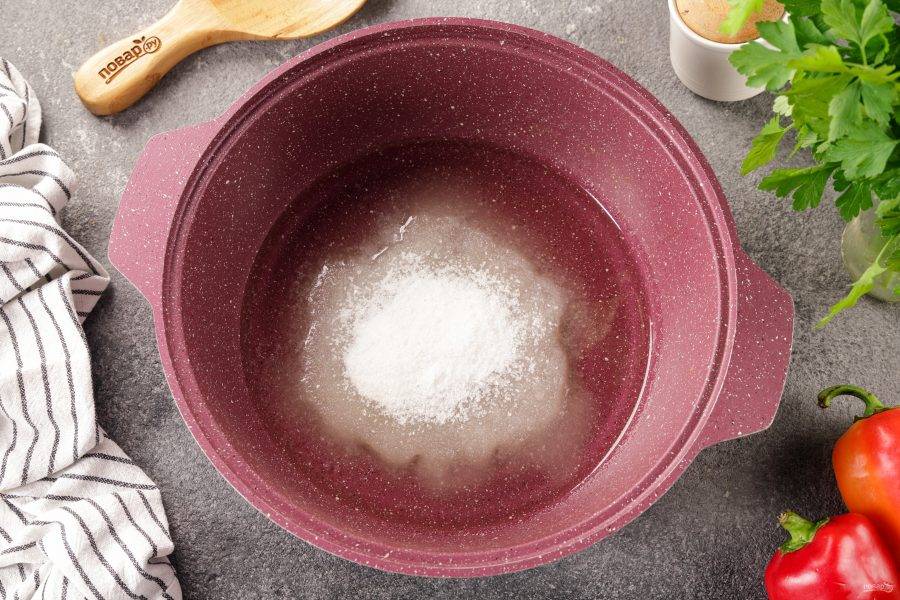 Для приготовления берите глубокую посуду с толстым дном. Налейте растительное масло, добавьте соль и сахар.