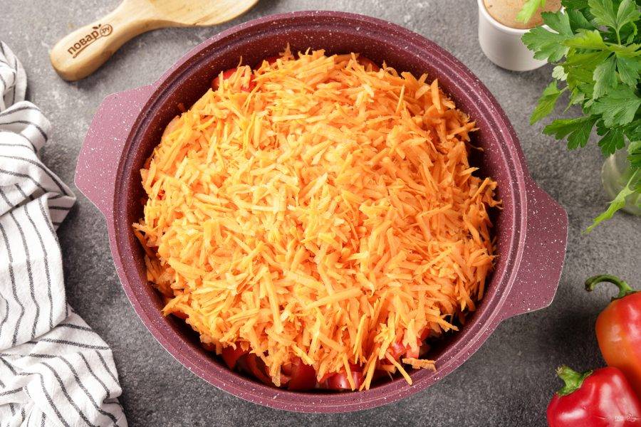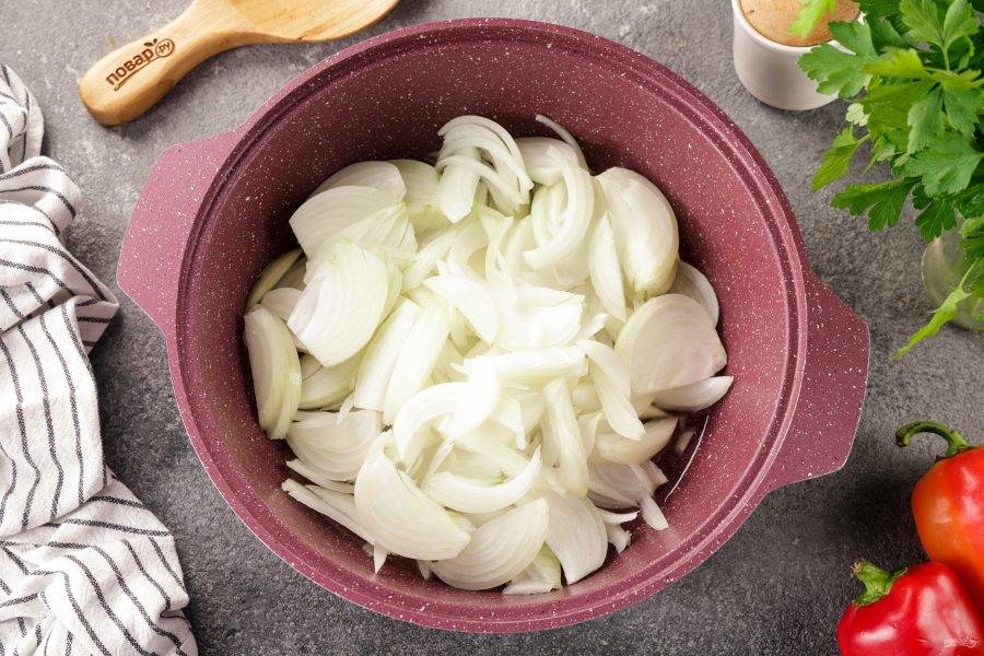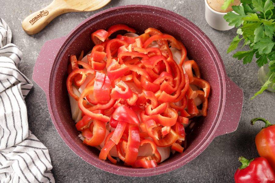 Болгарский перец очистите от семян и нарежьте соломкой.