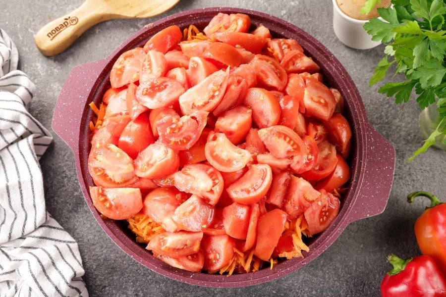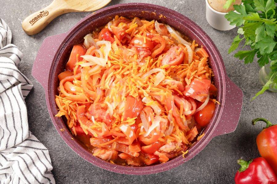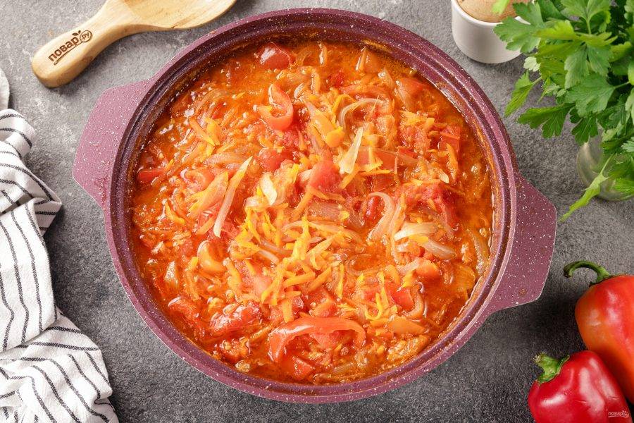 Поставьте на огонь и накройте крышкой. Когда овощи осядут, перемешайте. Доведите до кипения, снимите крышку и тушите на небольшом огне 30 минут. Периодически перемешивайте.
