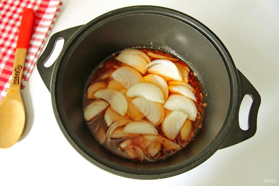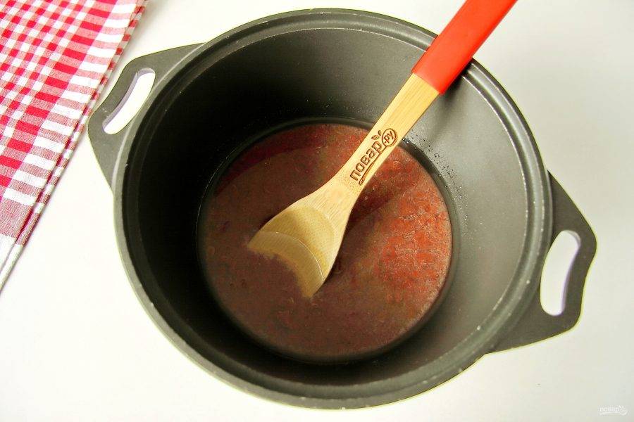 Разведите водой томатную пасту. Добавьте масло, соль и сахар. Помешивая доведите смесь до кипения.