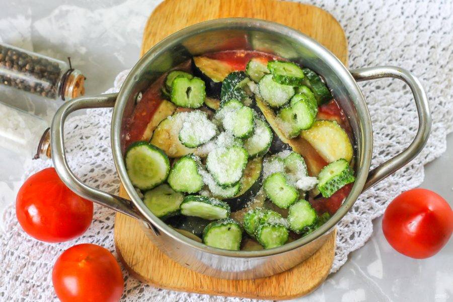 Промойте огурцы в воде, срежьте окончания овощей и нарежьте их кружочками. Высыпьте в кастрюлю вместе с солью, сахаром, молотым черным перцем. Поместите емкость на плиту и потушите около 20 минут.