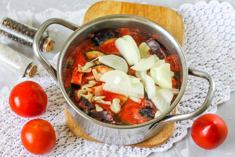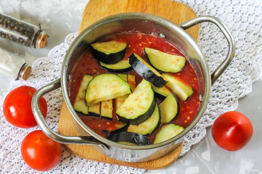 Перелейте томатную массу в казан или кастрюлю. Промойте баклажан, срежьте хвостики и нарежьте овощ полукольцами, добавляя в емкость.