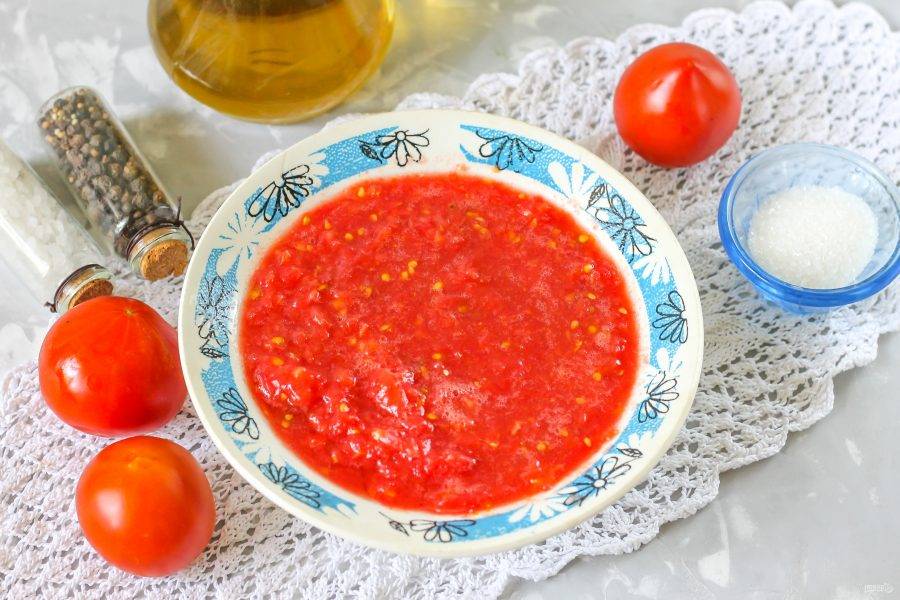 Помидоры промойте в воде, разрежьте и удалите зеленые черенки. Протрите их через терку с крупными или мелкими ячейками в глубокую емкость. Жмых удалите.