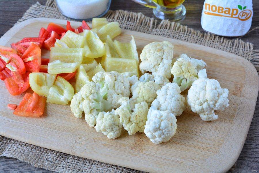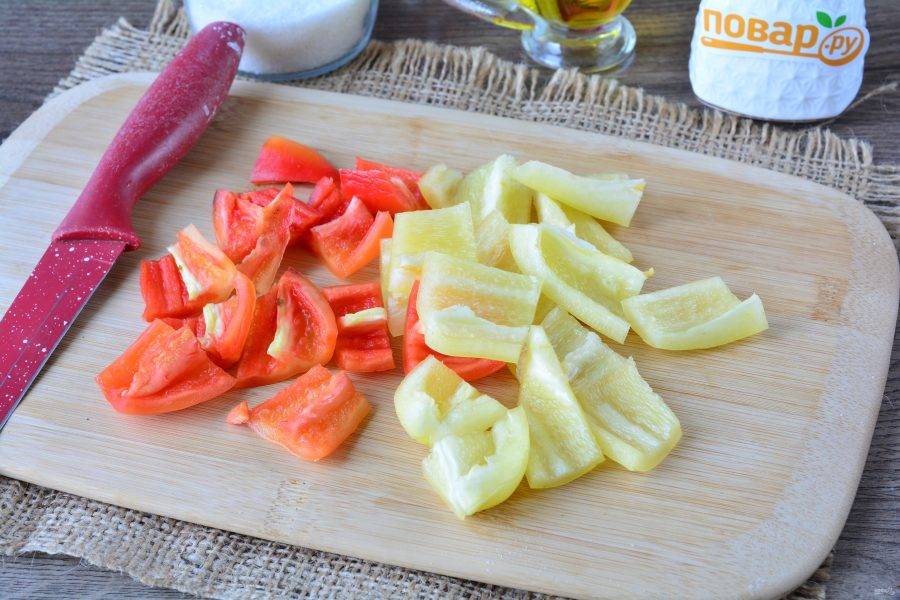 Почистите сладкий перец и нарежьте средними кусочками. Перец используйте любого цвета — зеленый, красный или желтый.