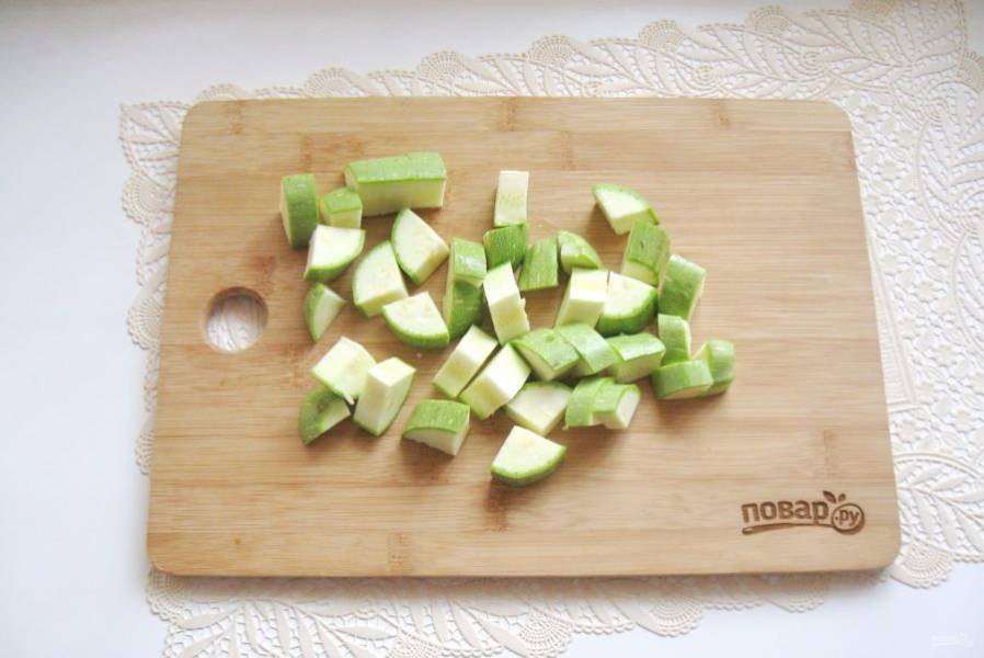 Кабачки помойте и нарежьте кубиками. Молодые можно не чистить, а зрелые обязательно очистите и удалите семечки.