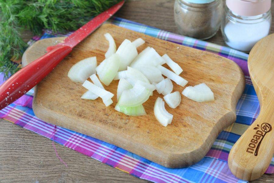 Репчатый лук почистите и нарежьте четверть кольцами.