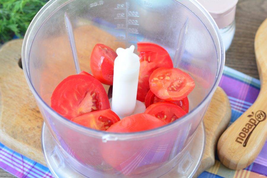 Помидоры нарежьте крупными дольками, сложите в чашу блендера.