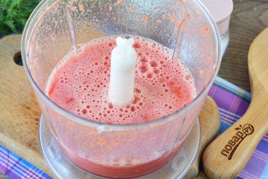 Помидоры взбейте в блендере, чтобы получилось пюре.