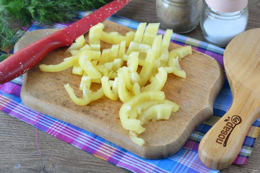 Почистите сладкий перец от семян, срежьте хвостики. Овощи нарежьте полосками.