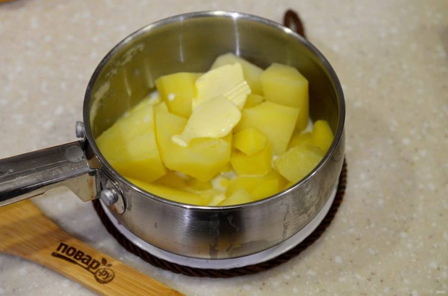6. Воду слейте, добавьте масло и молоко. Пюрируйте.