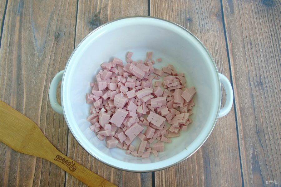 Вареную колбасу нарежьте небольшими кубиками и выложите в кастрюлю.