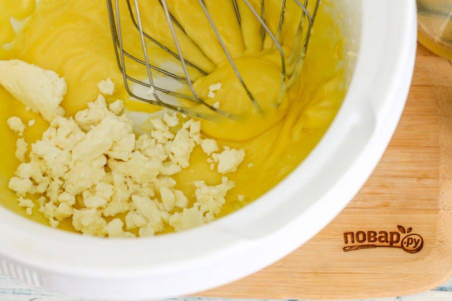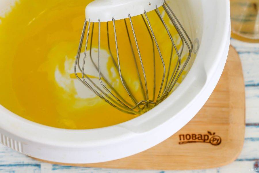 Взбейте их в течение 3-4 минут до побеления массы. Это нужно делать качественно, так как в плохо взбитые желтки масло не вмешается!