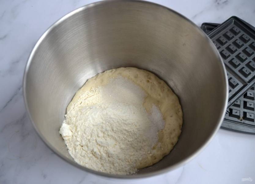 В чашу для смешивания добавьте всю закваску, оставшуюся муку (120 граммов), сахар (обычный) и соль.