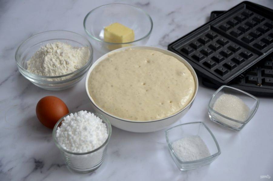Вафли получаются хрустящие, карамельные благодаря жемчужному сахару, который можно видеть на поверхности вафель.