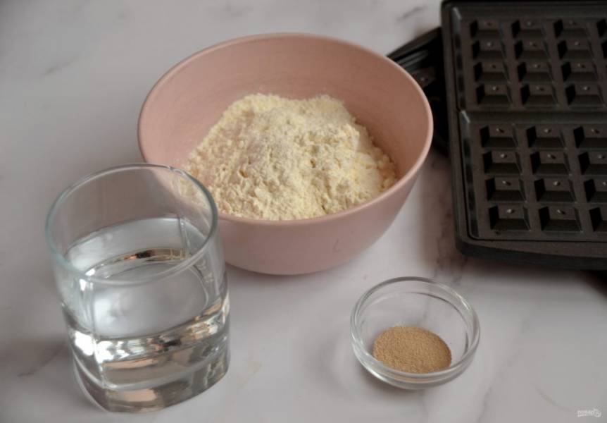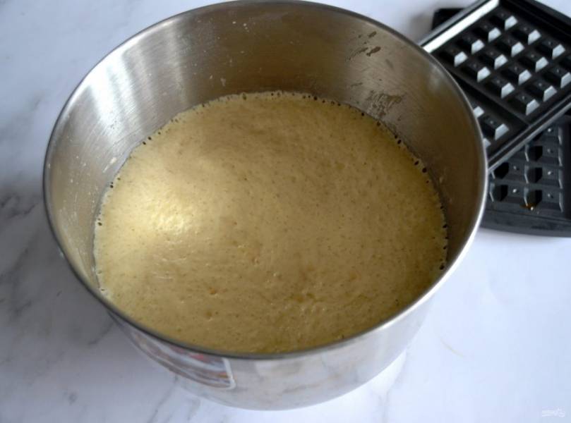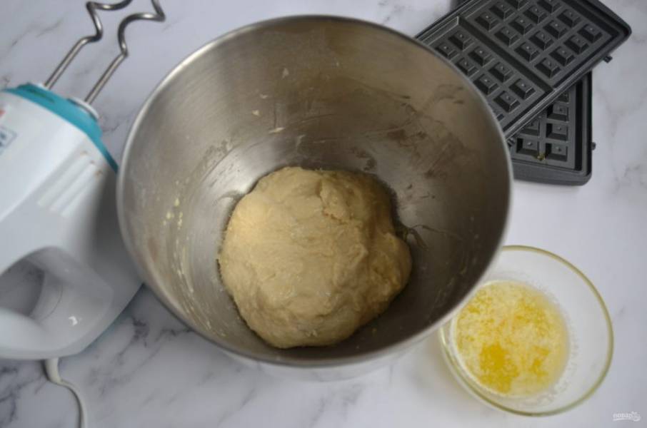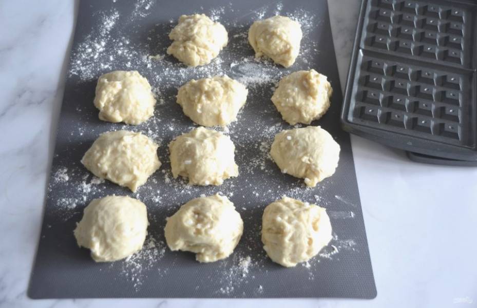 Разделите тесто на равные кусочки весом около 60 граммов. Разогрейте вафельницу.