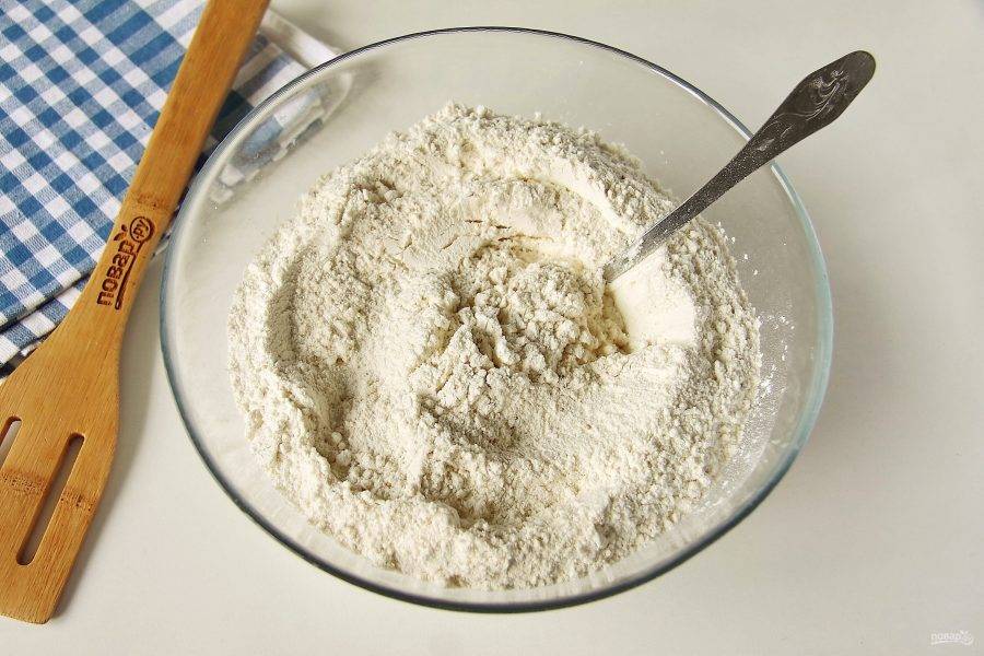 В глубокой миске соедините муку, дрожжи, соль и сахар.