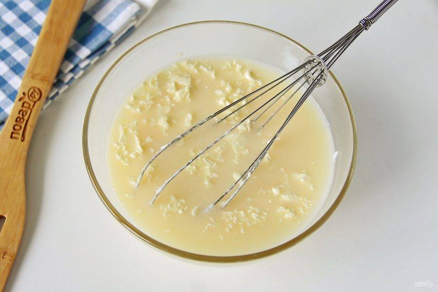 В другой миске смешайте теплую воду, мягкое сливочное масло и яйца.