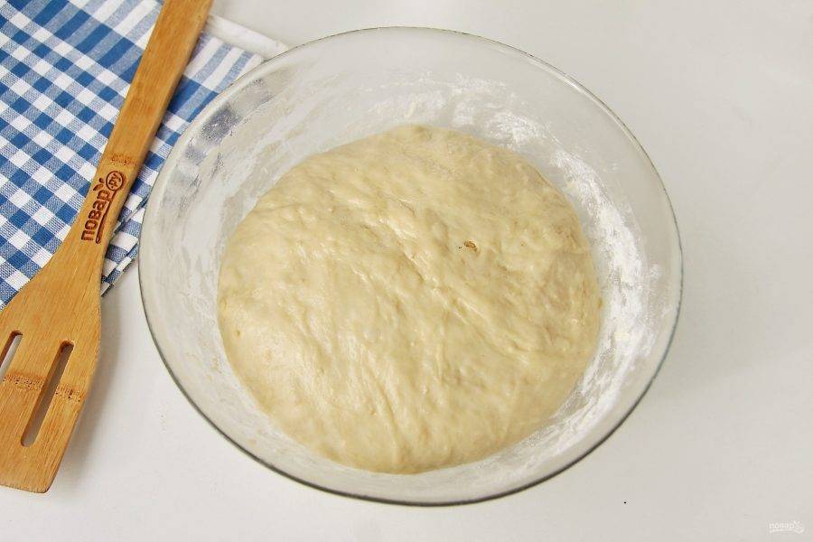 Соедините содержимое обеих мисок и замесите тесто. Если тесто покажется жидковатым, добавьте еще 1-2 ст.л. муки. Не поддавайтесь искушению подсыпать муку еще и еще! Тесто должно быть мягкое и достаточно липкое, иначе оно потеряет свою пористость и воздушность. Соберите тесто в шар, смажьте маслом, накройте и оставьте в теплом месте примерно на 1 час.